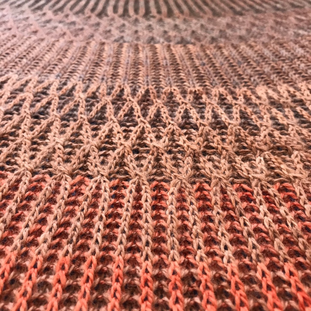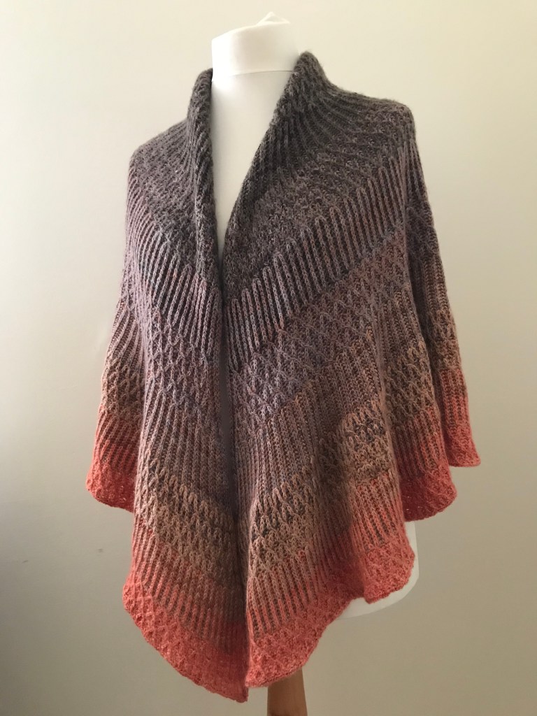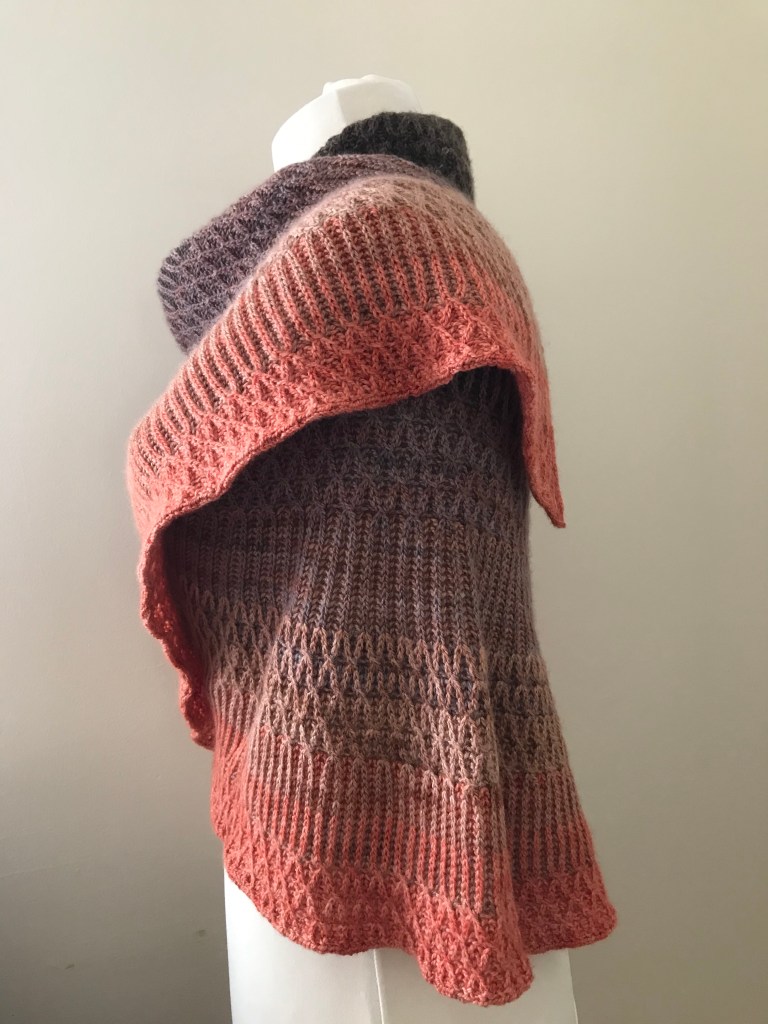 The sample shawl had a gauge of 20 stitches and 22 rows of two colour brioche rib in a 10cm x 10cm (4” x 4”) square, after blocking.