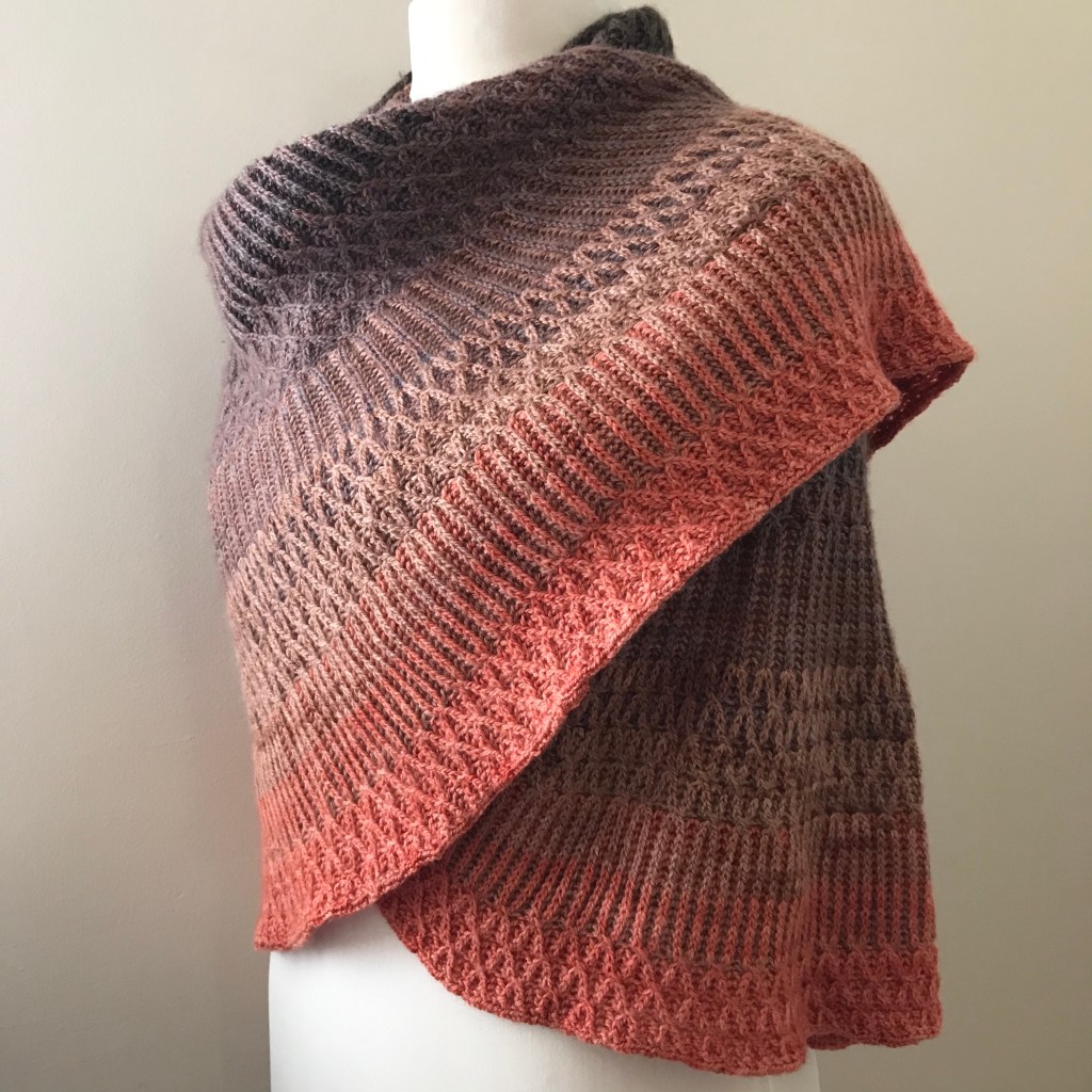 Using one and two colour brioche, this pattern blends four different colours of fingering weight yarn into a slightly wider than semicircle shaped shawl. Use four co-ordinating colours to get a gradient effect, or go with contrasting colours for a blockier look.