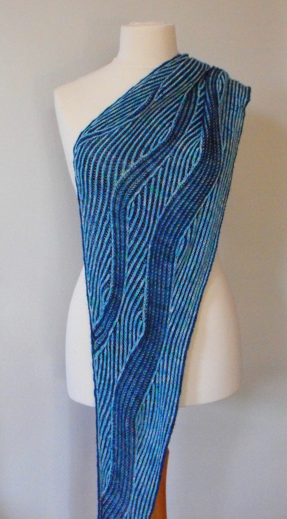 A long, narrow, triangular shape, this shawl starts with just a few cast on stitches. Two colour syncopated brioche is used to depict a vanishing (or evanescent) wave.