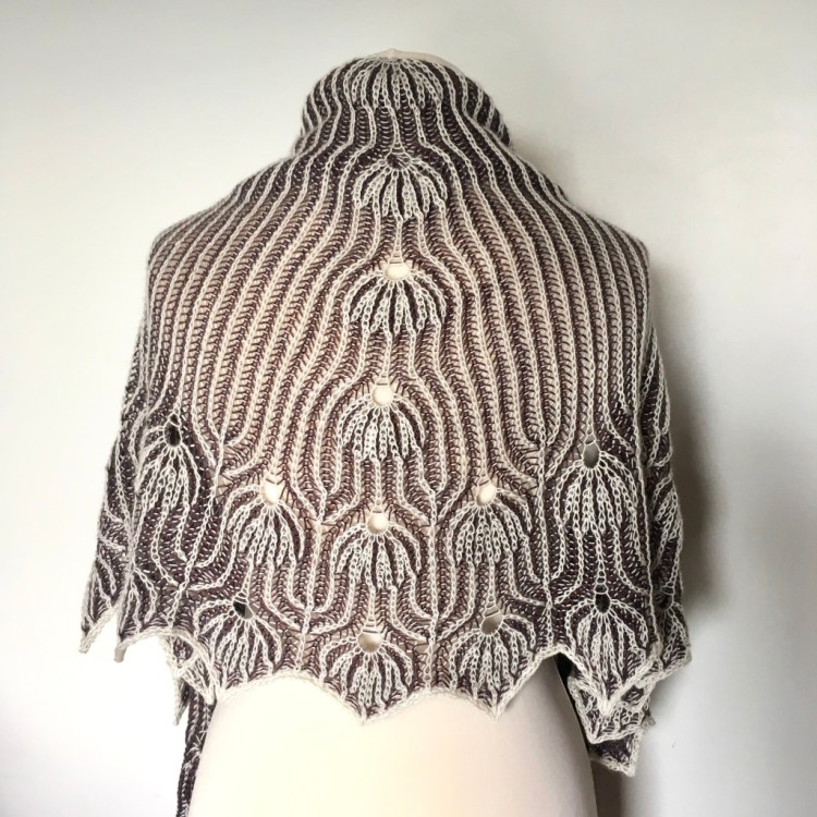 The sample shawl had a gauge of 15 stitches and 24 rows in brioche rib in a 10cm x 10cm (4” x 4”) square, after blocking.