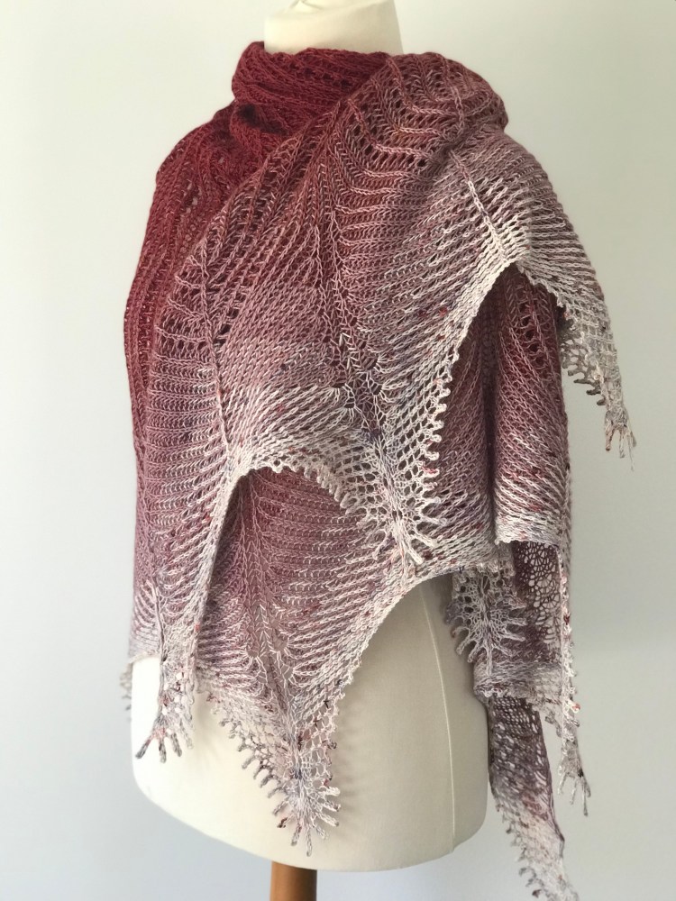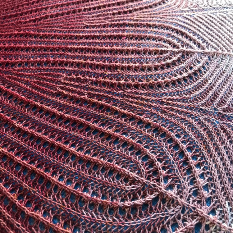 The name ‘octameric’ refers to the eight-fold symmetry of the shawl. The rippled edge of the shawl is reminiscent of sea creatures which is fitting since most creatures with an eight-fold symmetry live in the sea.