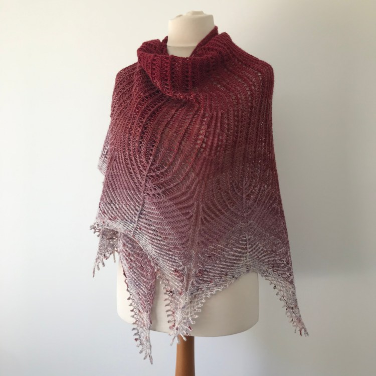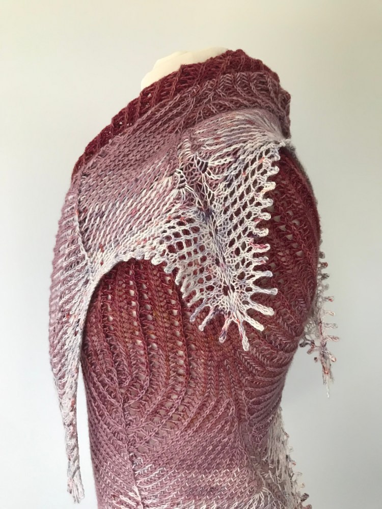 Wingspan 230cm/92″, depth 96cm/38.5”, relaxed after blocking.