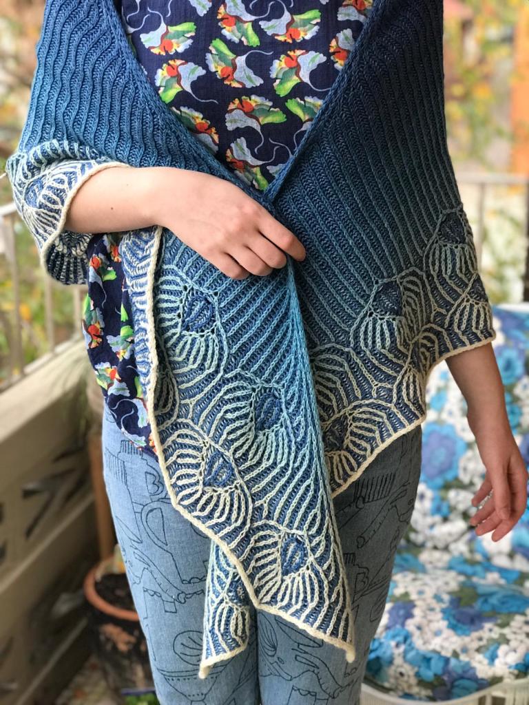 To me the border motif looks like feathers, so I named the shawl ‘plumology’, meaning the study of feathers.