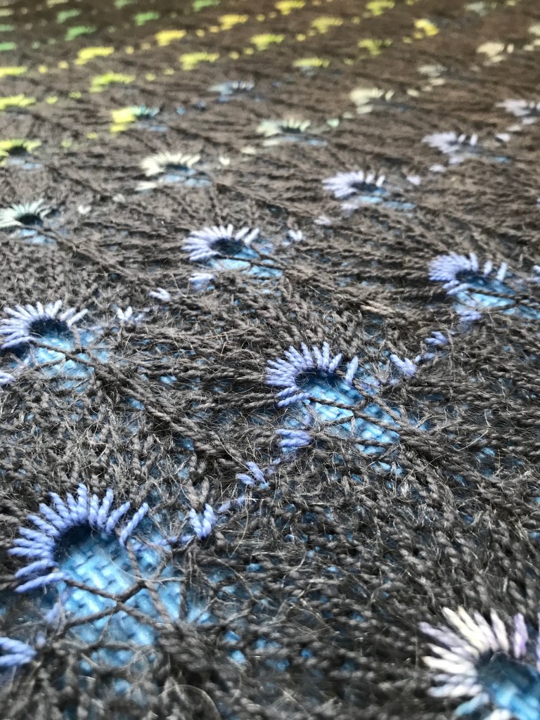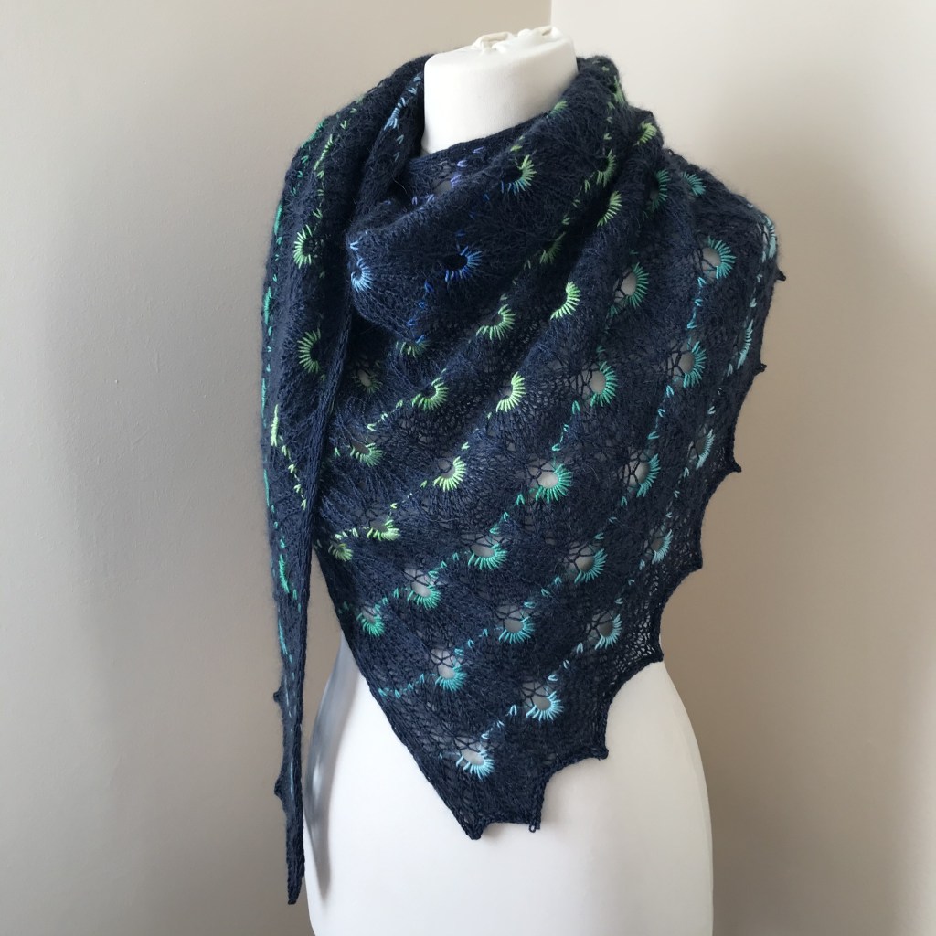 The bursts of colour against the dark blue used in my shawl reminded me of fireworks, therefore I decided on the name Skyfire.