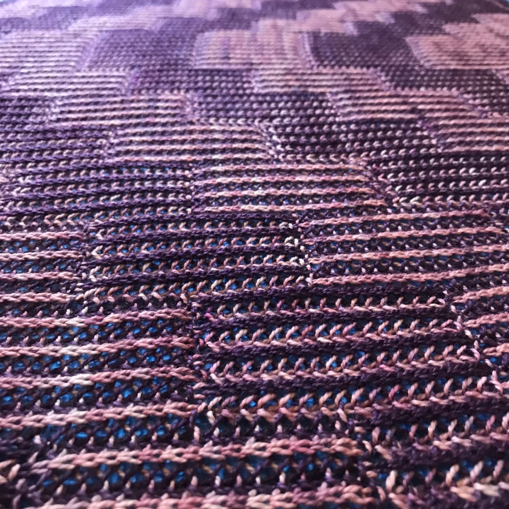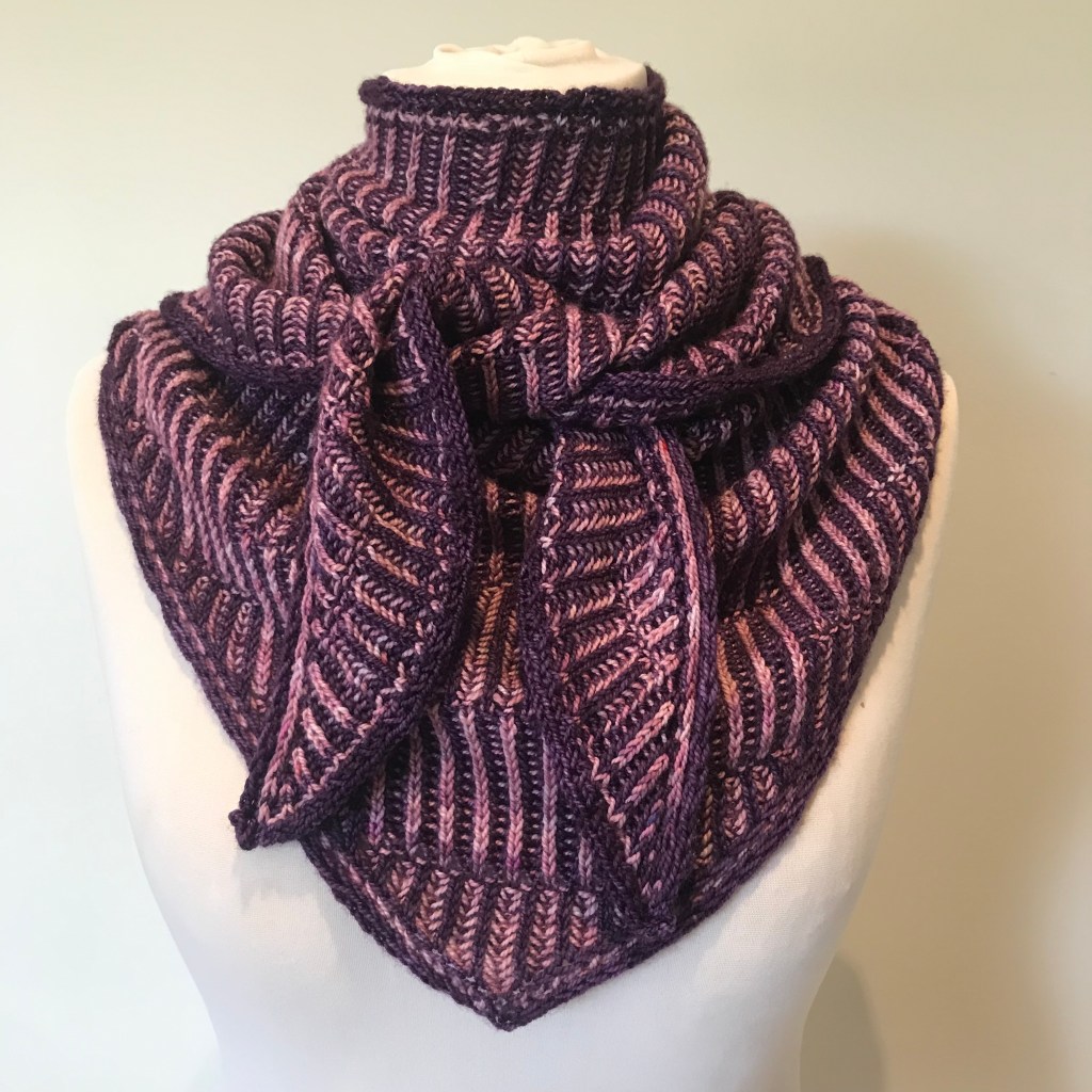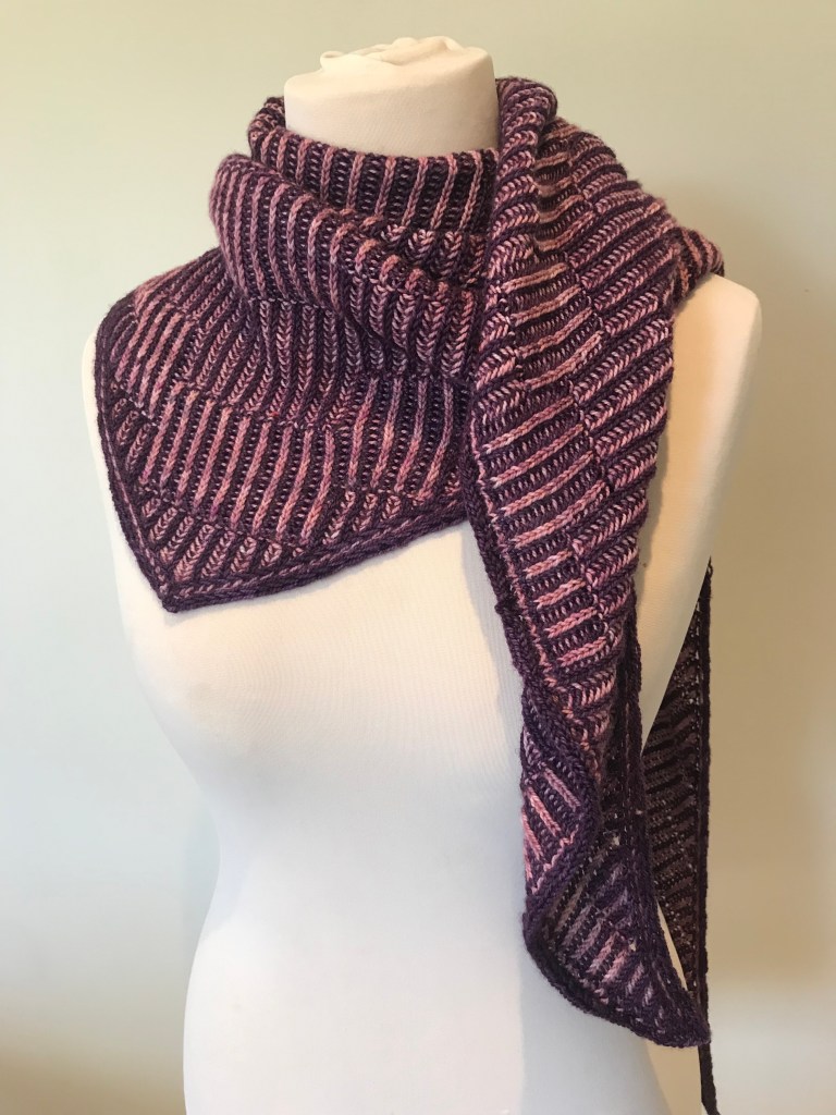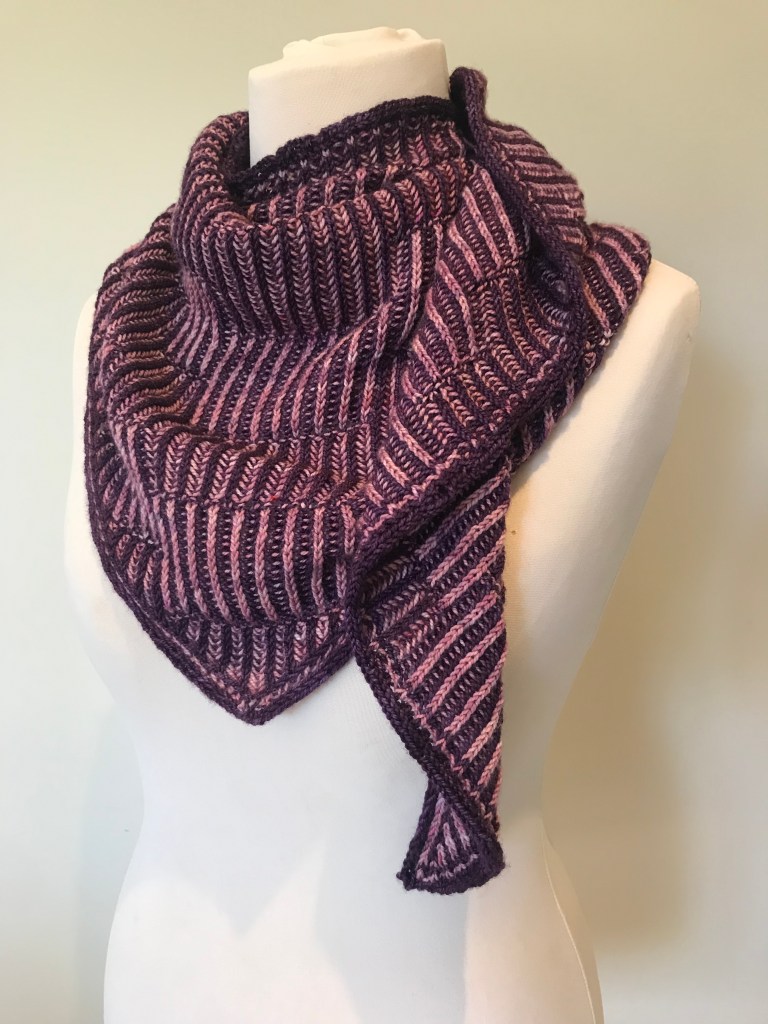 Ever heard of illusion knitting? It’s a technique where you use knits and purls on a background of two colour garter stripes to make a pattern appear when you view the knitting from an angle. This triangular, two-colour brioche shawl is a translation of the concept of illusion knitting from garter stitch into brioche. At first glance it looks like fairly ordinary brioche rib, but catch it from the right angle and you can see the pattern that is hiding in plain sight.