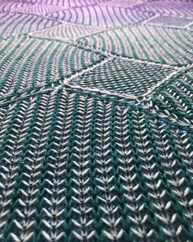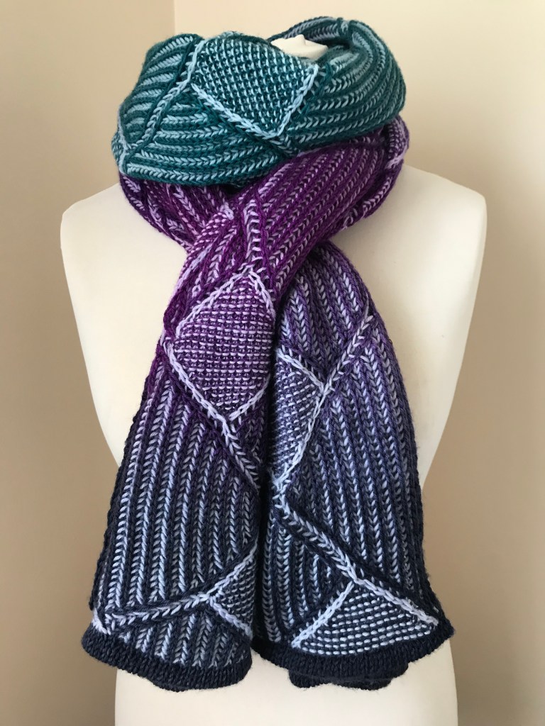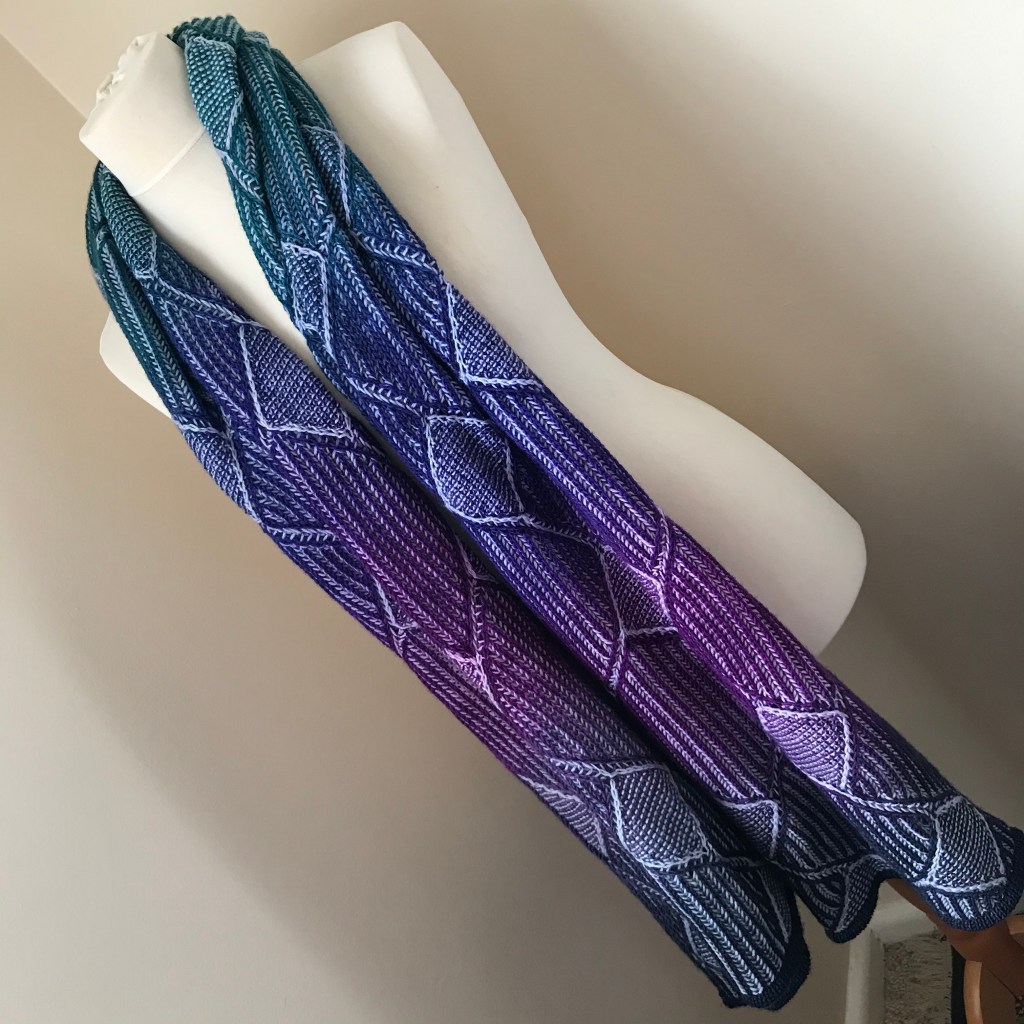 A tessellation or tiling is the covering of a surface, often a plane, using one or more geometric shapes, called tiles, with no overlaps and no gaps. This wrap is an interpretation of a simple tiling pattern in two colour brioche and garter stitch.
