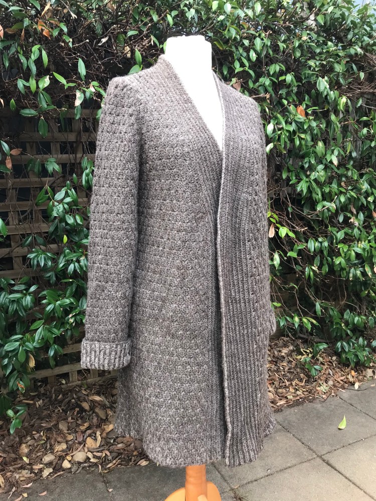 This long, open front brioche cardigan is designed to be an easy to wear, warm and comfortable but stylish addition to your wardrobe. The stitch pattern was carefully chosen to minimise the usual stretchiness of brioche so that, with the set-in sleeves and seams at the shoulders and sides to give structure, the garment should keep its shape, wear after wear.