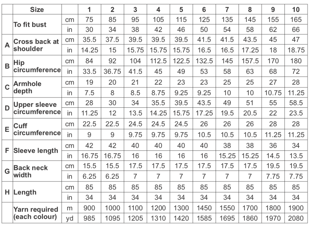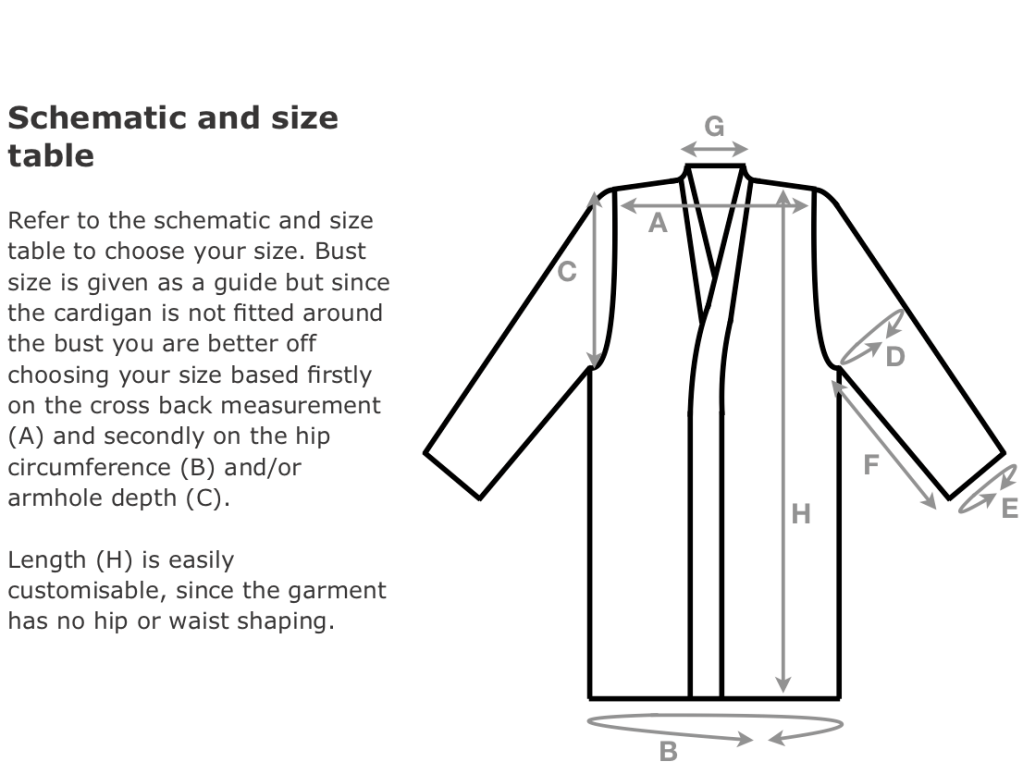 To fit bust sizes 75, (85, 95, 105), [115, 125, 135], {145, 155, 165}cm or 30, (34, 38, 42), [46, 50, 54], {58, 62, 66}”. Refer to the schematic and size table to choose your size. Bust size is given as a guide but since the cardigan is not fitted around the bust you are better off choosing your size based firstly on the cross back measurement (A) and secondly on the hip circumference (B) and/or bust circumference. Length (H) is easily customisable.