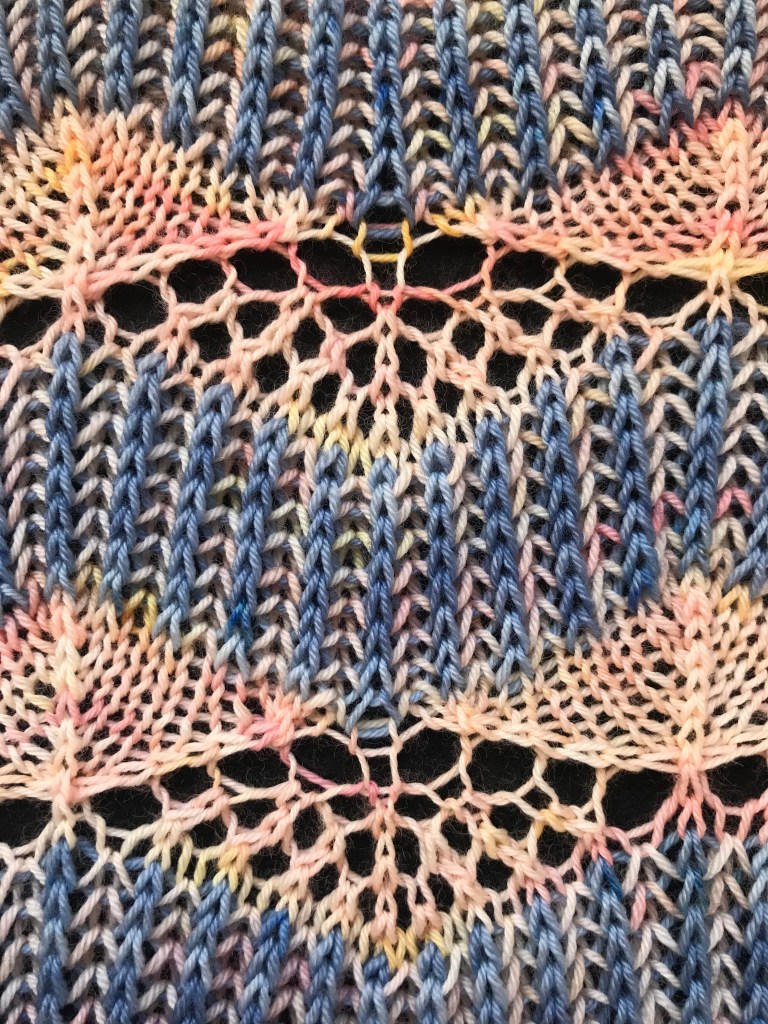 A few more years on, and I made those yarns into a shawl, using alternating bands of brioche and lace to represent the bands of temperature anomalies traveling westward across the ocean that had been shown in that long ago thesis result.